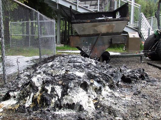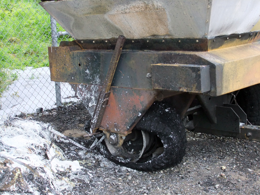 The rubber on the rear tractor tires had bubbled. The tires on the hopper were totally burned off their wheels. A big glob of unrecognizable material oozed next to the scorched hopper.