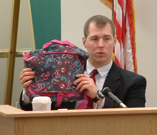 JPD Detective Krag Campbell holds up a backpack that Ashley Johnston allegedly wore at Adair-Kennedy Memorial Park during the arson on June 19th. Photo by Matt Miller/KTOO News