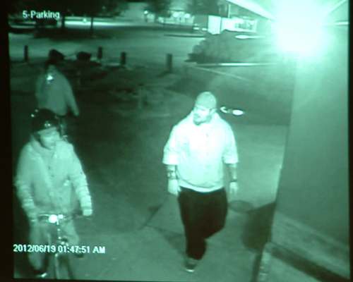 Still of security camera footage that prosecutors say shows Ryan Martin (left) and Ashley Johnston (right on bicycle) at Adair-Kennedy Memorial Park before the arson on June 19th. Photo by Matt Miller/KTOO News