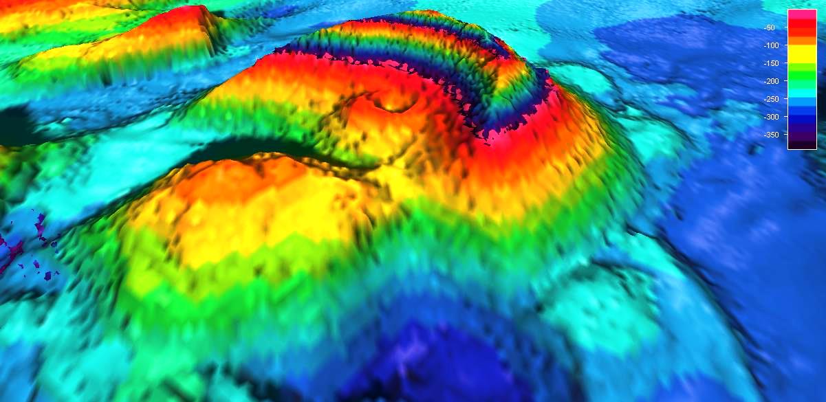 “From that, we could see the angle of the slopes,” he said. “We did one deep dive, about 340 feet down. You could kind of tell the way the thing was put together. The lower material was … lava that was quenched in the marine environment, and the upper stuff was the airfall.”