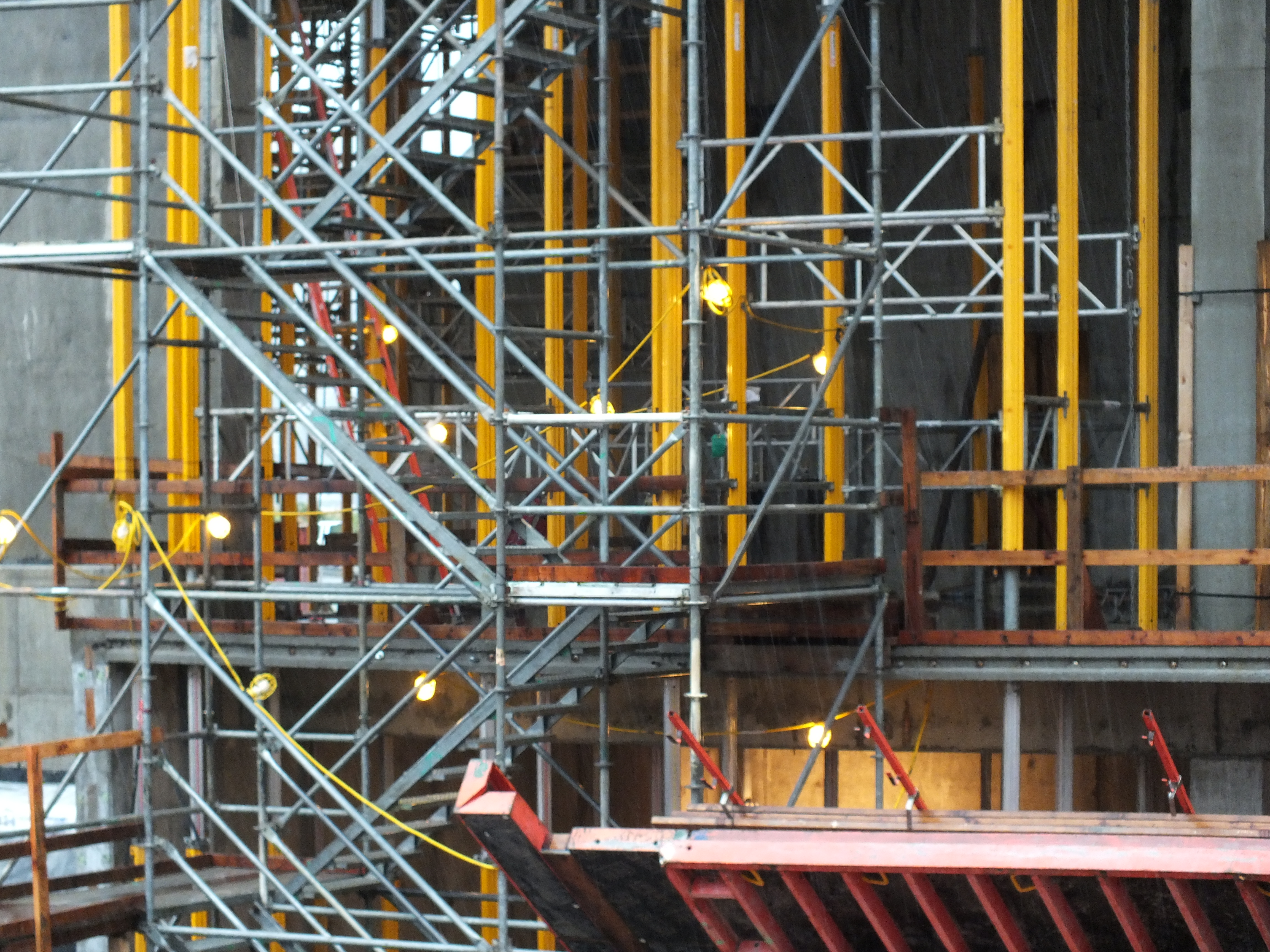 On Wednesday, a pumping vehicle with an articulated boom pipe reached into the interior of the structure to pour concrete for the second floor slab as a chain of cement trucks came and went from the construction site.