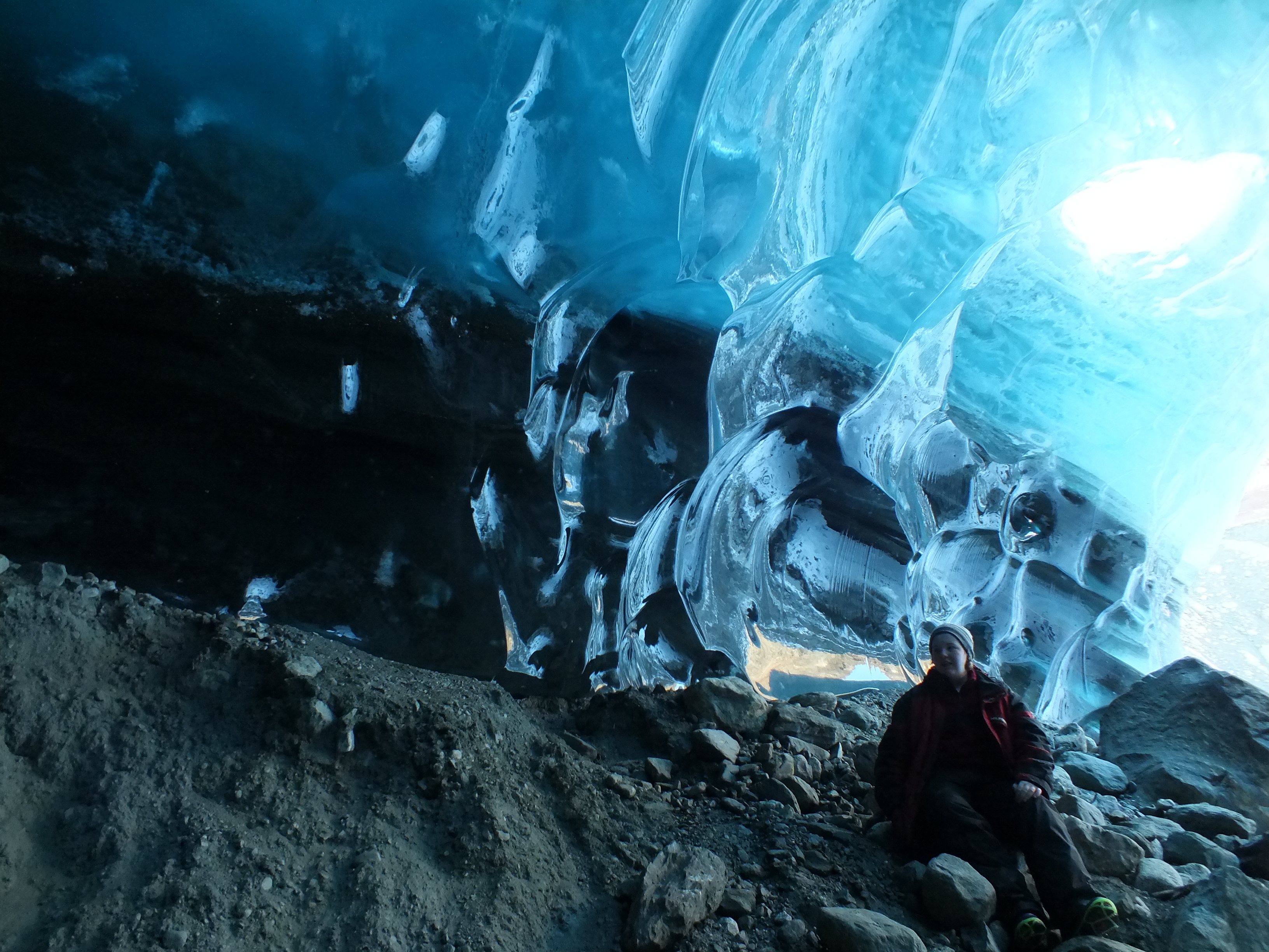 You get water running over the surface of the glacier and it drops into a crevasse. Water is more dense than ice and it wants to move downward, and so it basically drills a hole through the glacier. That’s probably just something that formed at the surface. It could’ve been there for a long time and maybe – as the glacier has moved down-valley – it’s now just right in the same spot as where that ice cave is.”