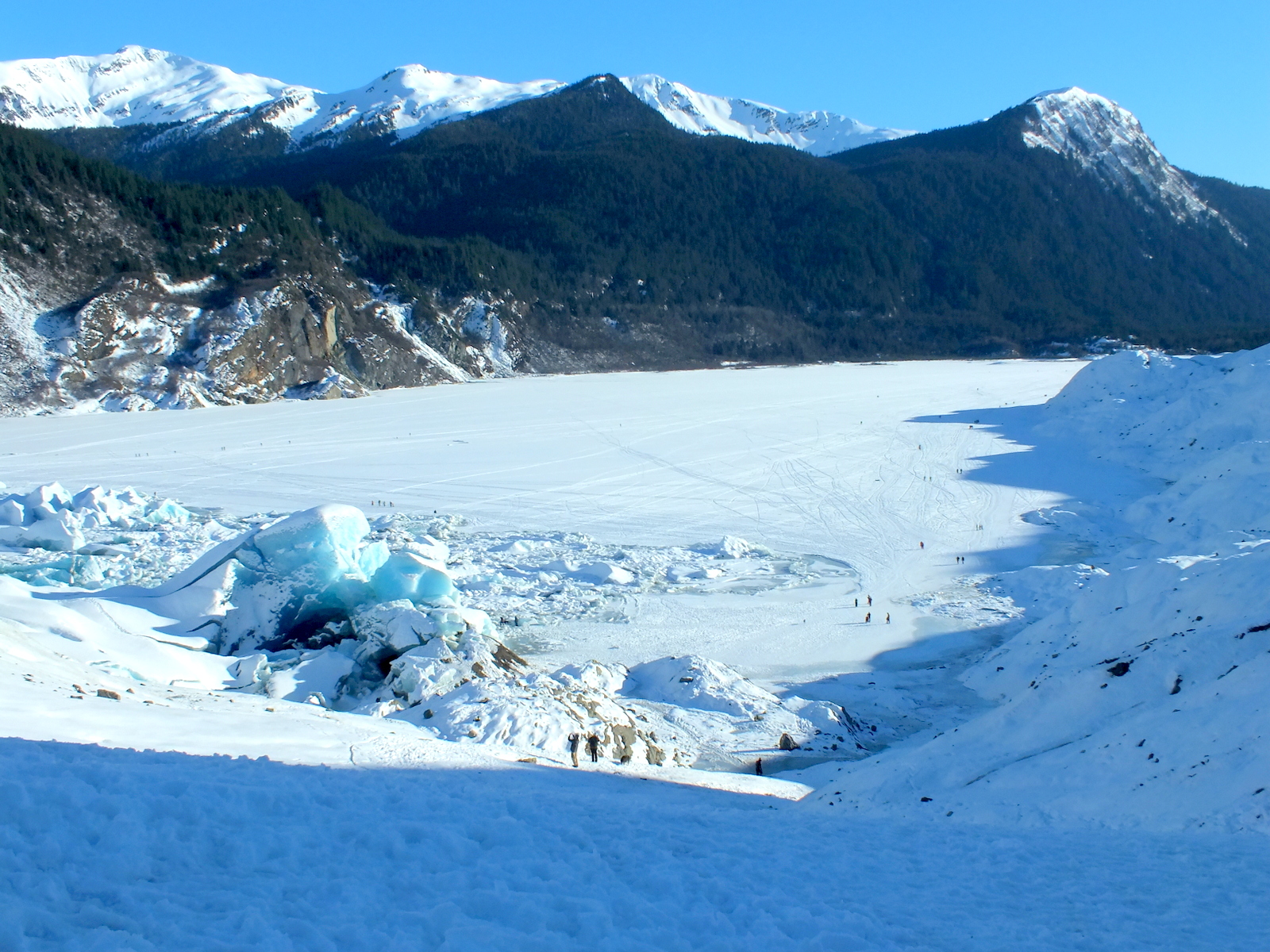 The Mendenhall calves all the time, even in the winter. Craig said the five-story high, snow-covered blocks of blue ice near the western edge broke off about a week ago. Calving events can cause lake ice to undulate or even shatter over large areas.