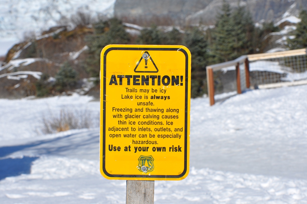 Signs are posted warning visitors of the dangers of the glacier and lake ice, part of which she calls a dynamic environment.