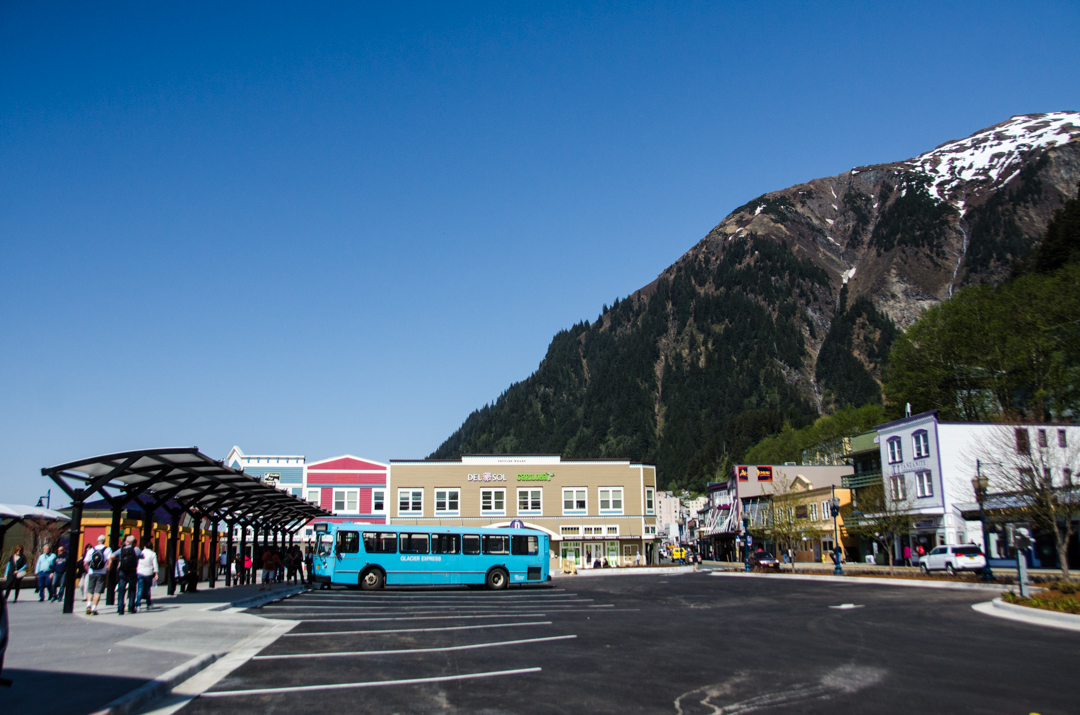 The single busiest spot in Juneau during the summer cruise ship season may be South Franklin Street in front of the Mount Roberts Tramway building. Up to five of the massive ships can be in town at once, each unloading and reloading thousands of crew and passengers in a few hours. There are buses, container trucks, float planes, and aerial tram cars all coming and going within a few hundred feet of each other.