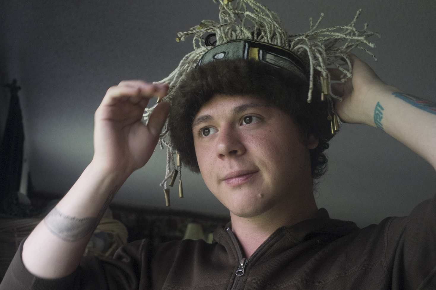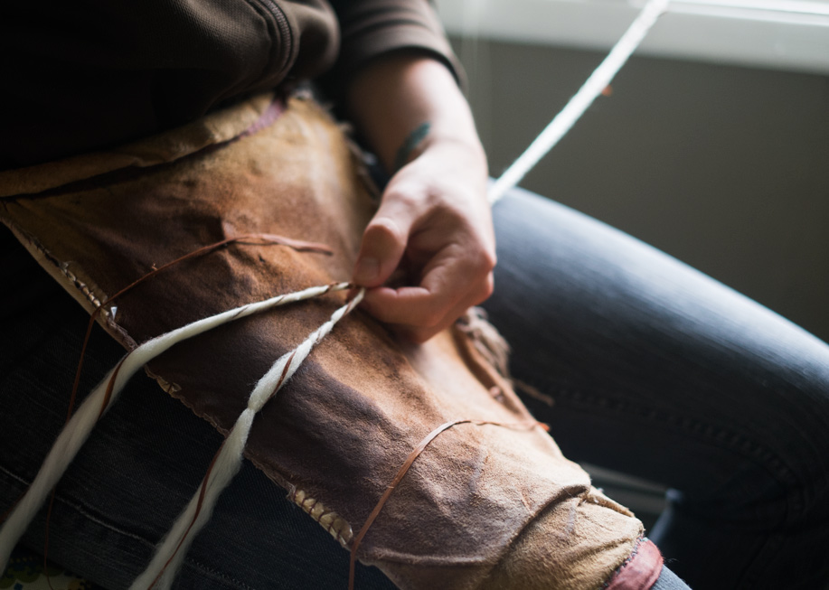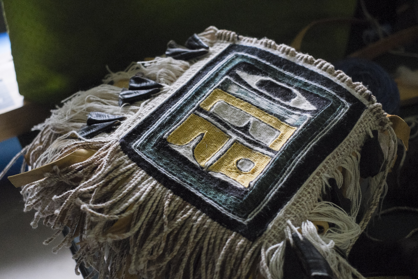 Back at Tagaban’s home studio, he lets me try on a pair of leggings decorated by deer hooves. They’re a work in progress, an old world object with a twist. Embedded in the traditional Chilkat pattern is a small patch of geometric Ravenstail weaving, a hybrid design that’s beginning to gain acceptance in Chilkat weaving.