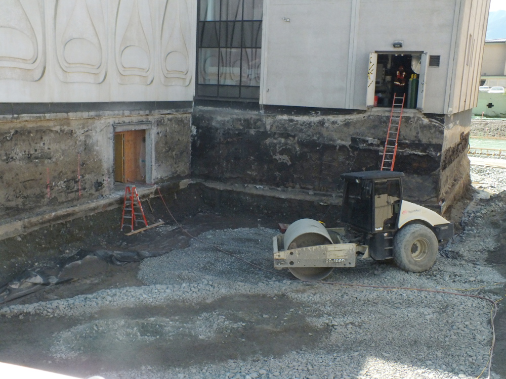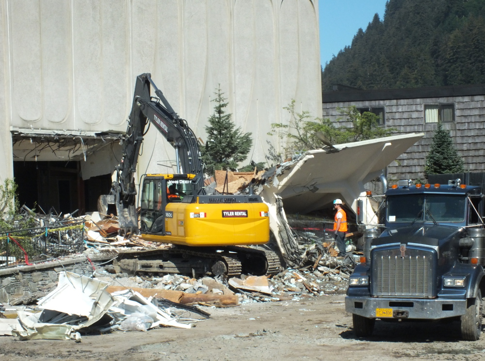 Contractors on Thursday demolished and removed the covered, front entrance of the 47-year-old Alaska State Museum in Juneau. They were scooping up all of the interior debris and hauling it away for disposal on Friday. Heavy equipment inside the building pushed out the interior debris as an excavator broke it up and loaded it into a waiting truck.
