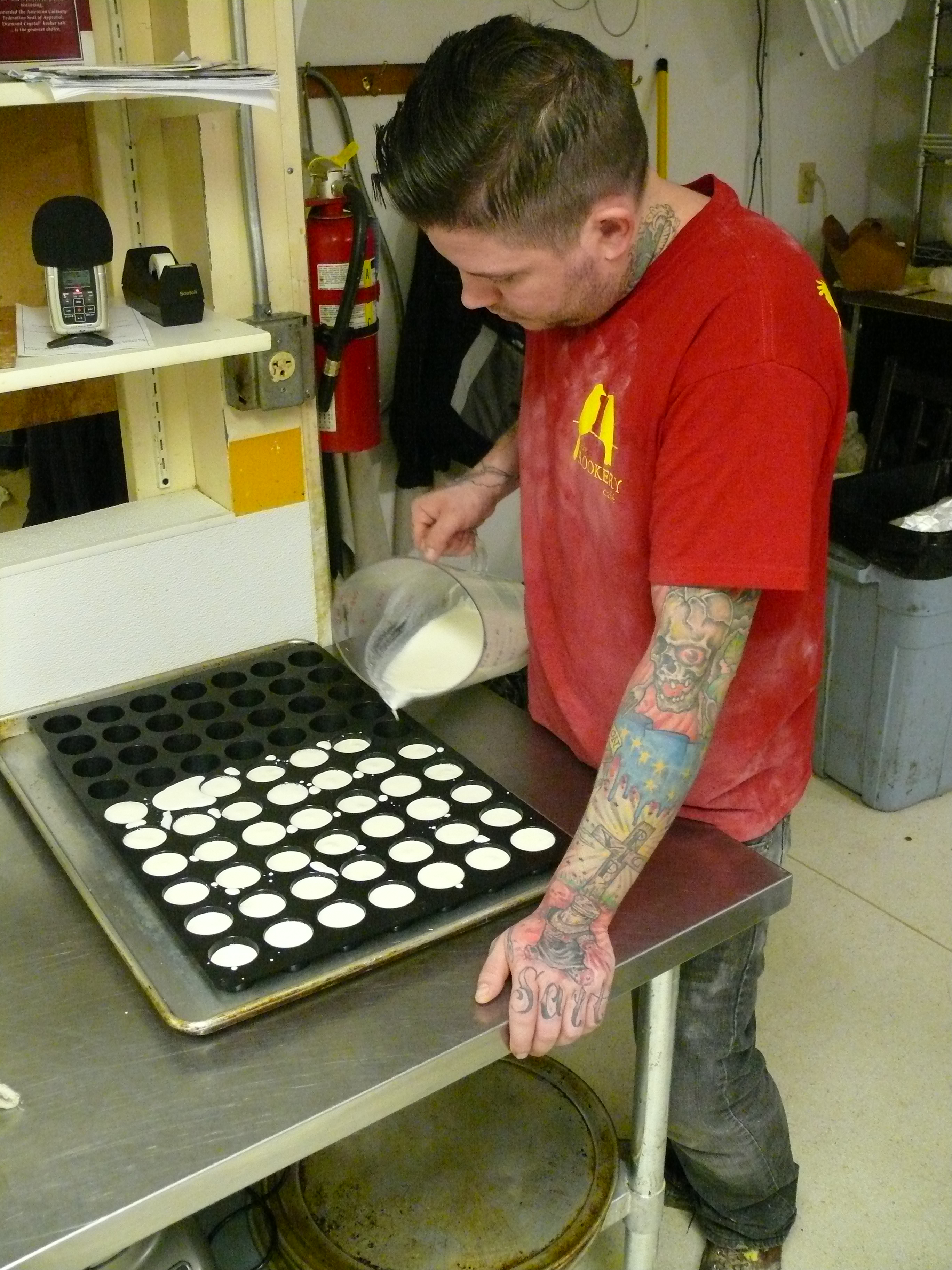 “We pickled some grapes with chai tea and we’re doing that with corn flakes and blue cheese. Then we got that bacon panna cotta–we’re doing that with passion fruit and avocado. Rachel is searing off duck livers to make a duck liver whipped cream and we’re going to put that on top of a gruyere cupcake.”
