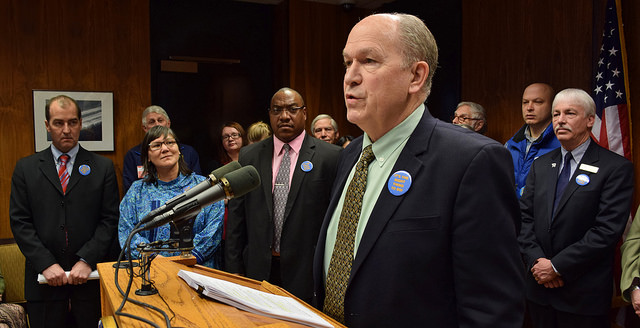 After rolling out the bill, the Walker administration gave the Medicaid supporters the microphone. They were wearing buttons that read “It’s the right thing to do,” and most came from various health and trade groups. The Alaska Hospital and Nursing Association, the Alaska Mental Health Trust, and the National Education Association were all represented, and they talked about the good expansion would do for their organizations and the people they service. But there were two people in attendance who would directly benefit from Medicaid.
