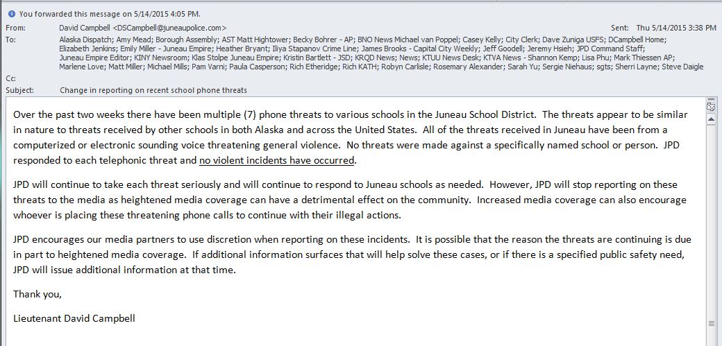 The Juneau Police Department will no longer issue press releases about threatening phone calls to schools. Lt. David Campbell made the announcement in an email Thursday.