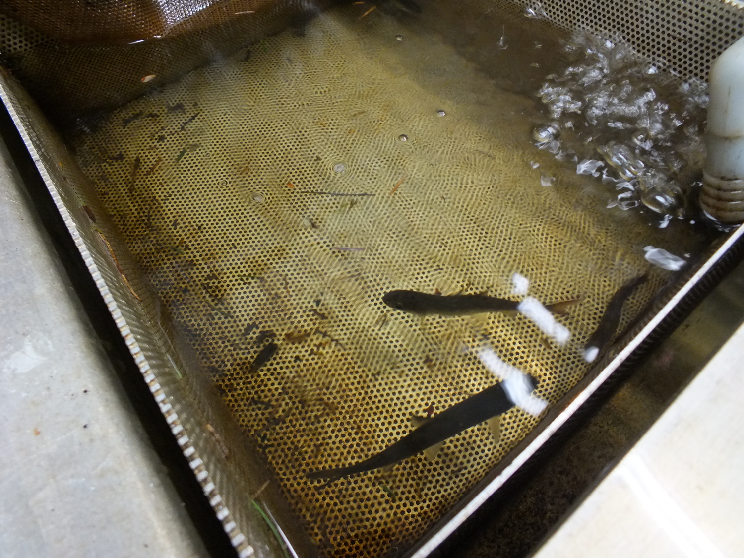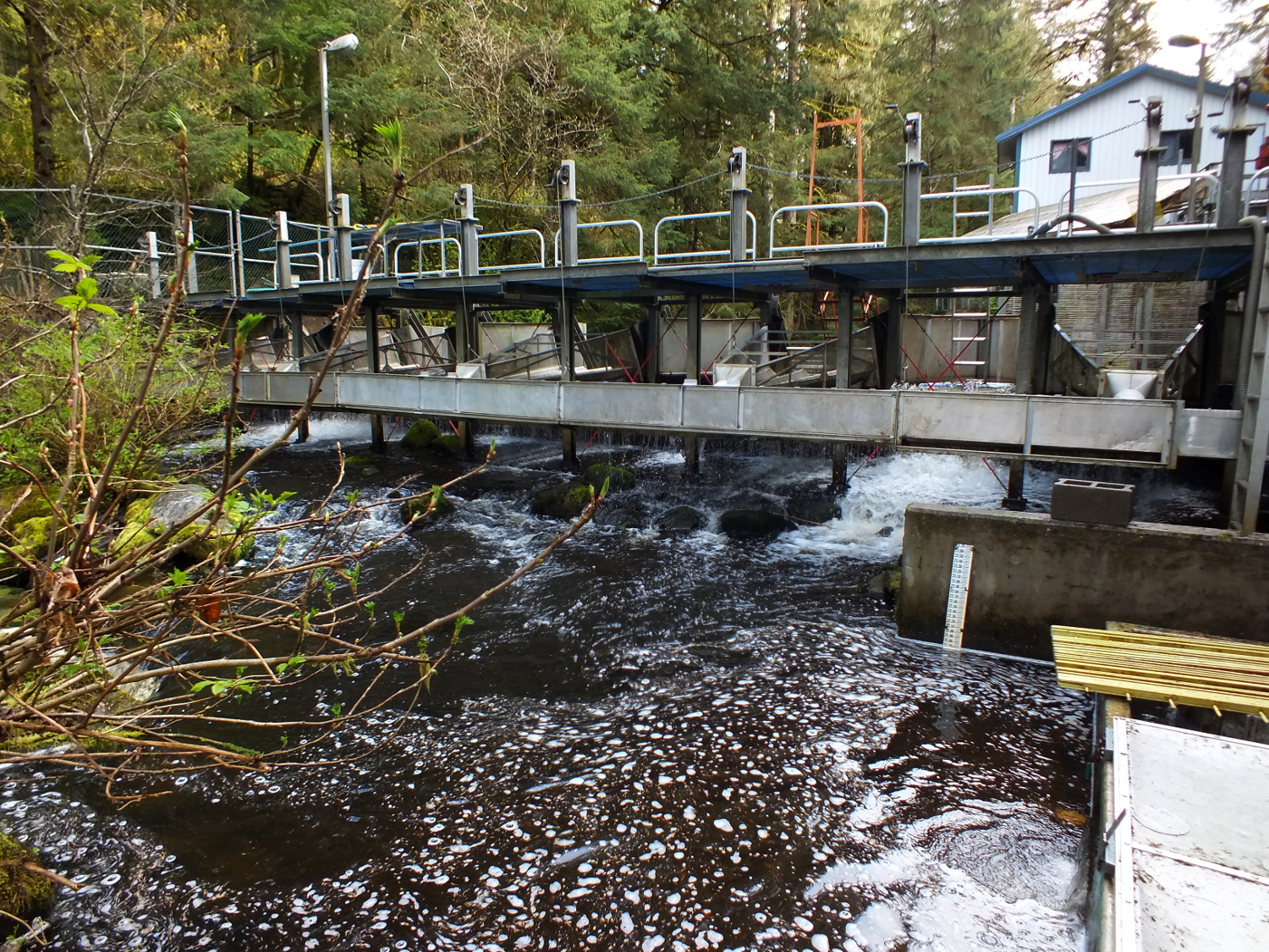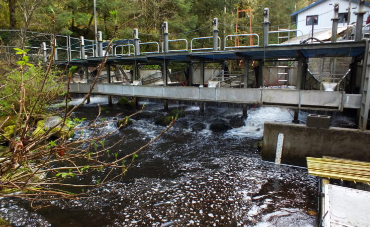 “It’s good to separate them because the little fish don’t like being in with the big fish,” says John Joyce, a fisheries research biologist with the National Oceanic and Atmospheric Administration, who points out the various cages for separating outgoing fry and smolt at the Auke Creek weir.