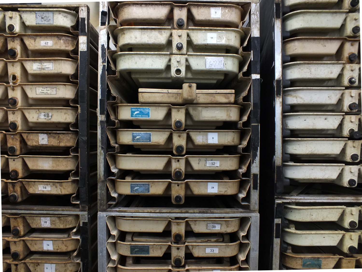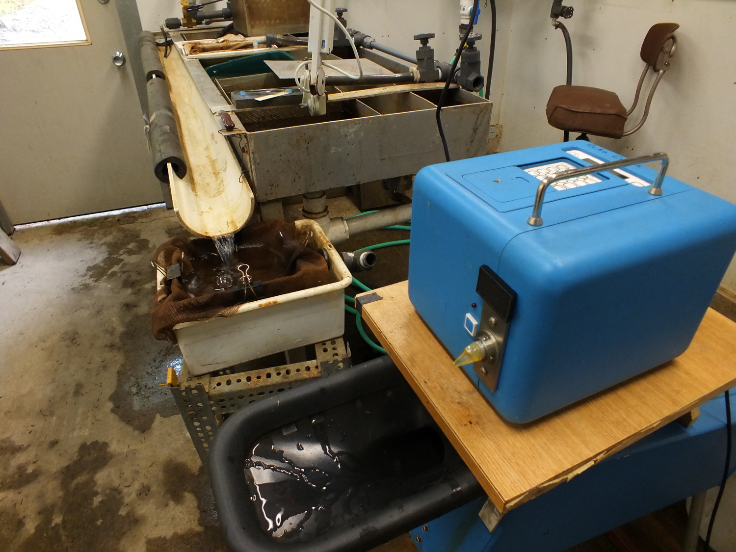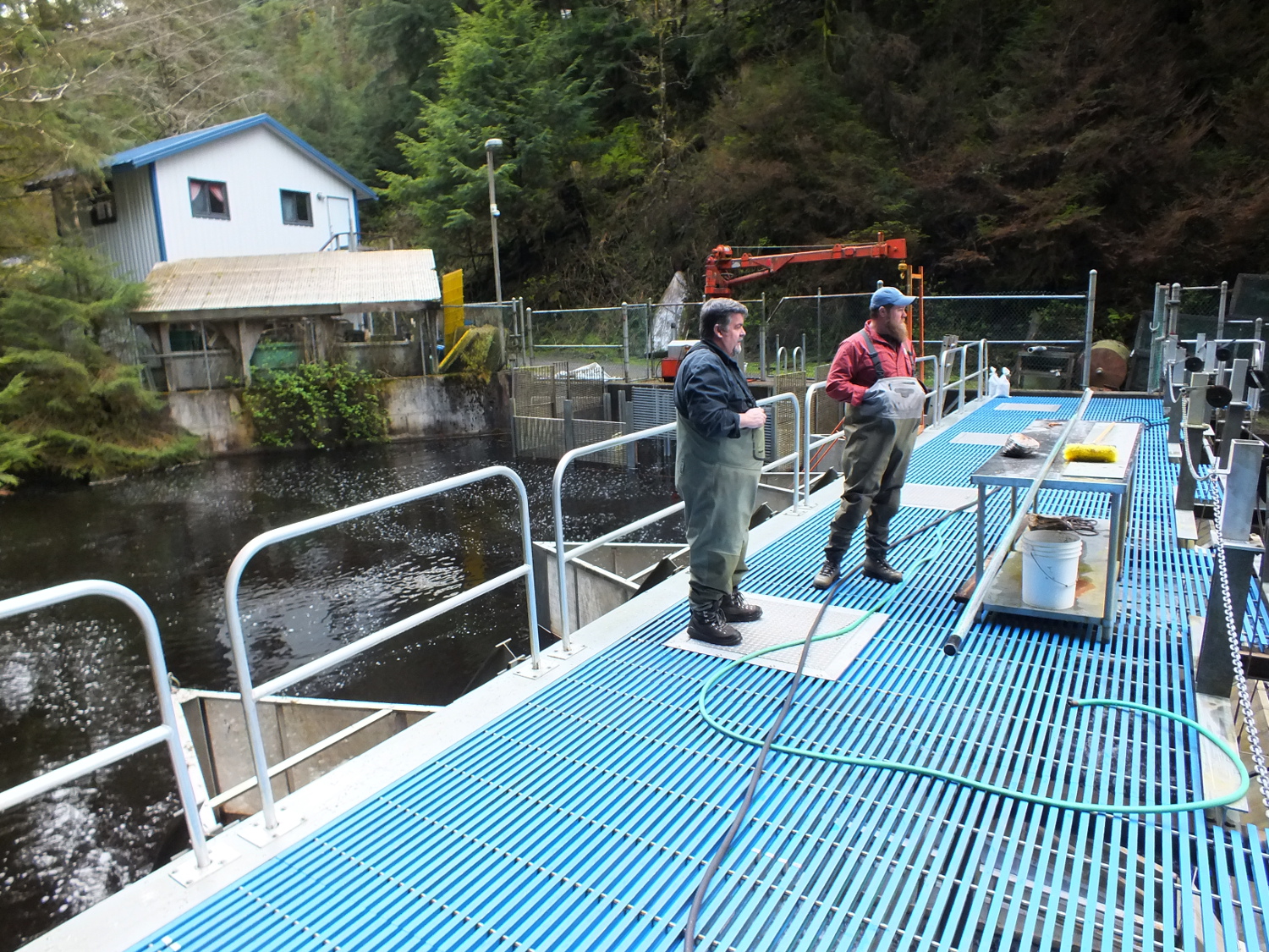“It’s good to separate them because the little fish don’t like being in with the big fish,” says John Joyce, a fisheries research biologist with the National Oceanic and Atmospheric Administration, who points out the various cages for separating outgoing fry and smolt at the Auke Creek weir.