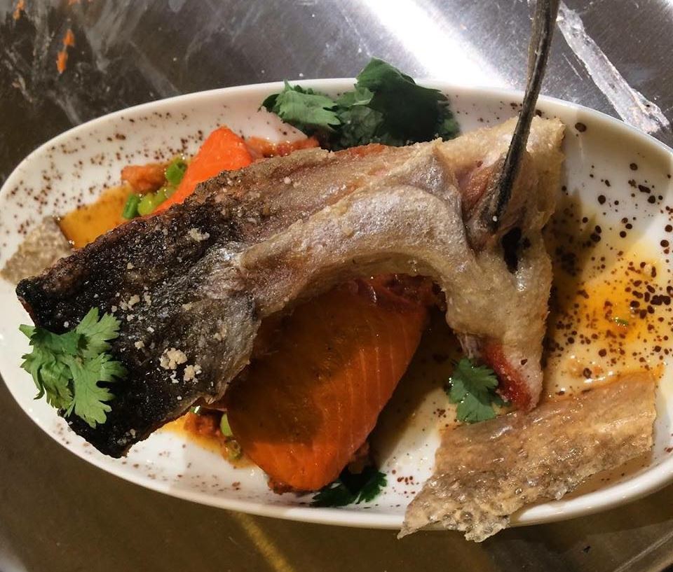 They made crispy chips out of the skin and fried the salmon collars, the bony part between the head and the body.