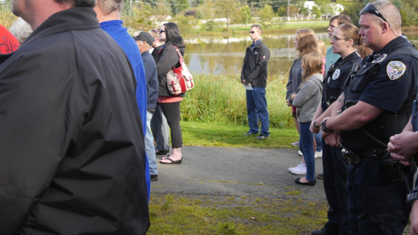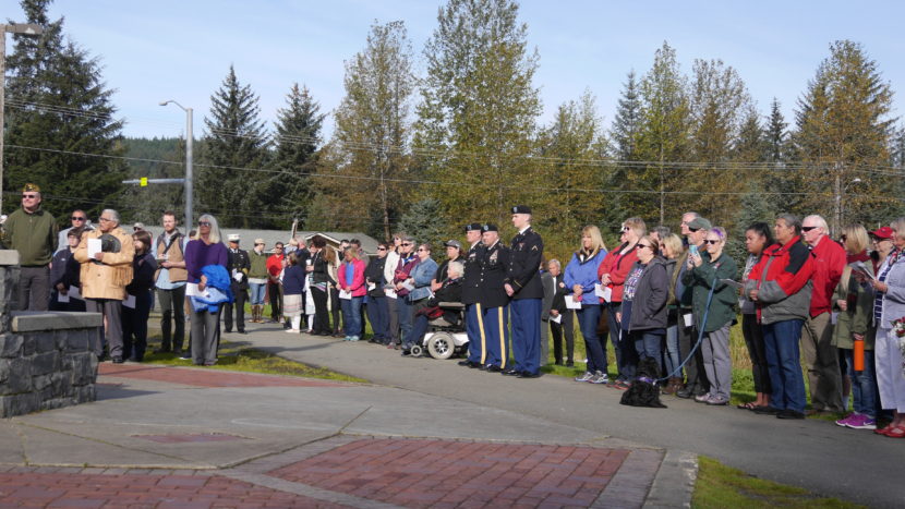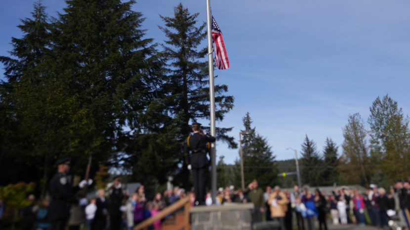 Hands covered hearts and veterans saluted as a Juneau Police Department Honor Guard raised the flag to half-staff in concert with a rendition of the Star Spangled Banner.