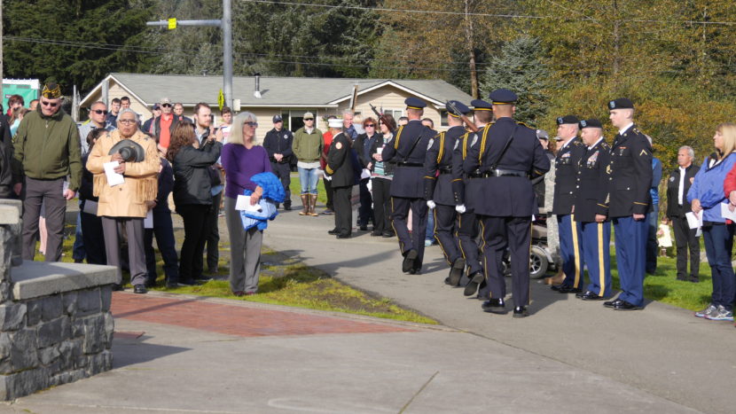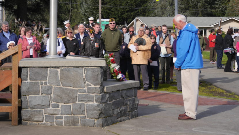 Juneau Mayor Ken Koelsch laid a ceremonial wreath at the memorial’s base while bagpipes played somberly in the background.