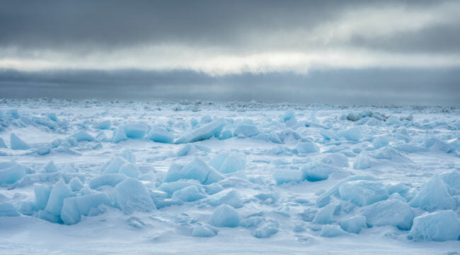 Then, the surface gets rougher. Big piles of broken ice start appearing — pressure ridges; they’re created when big chunks of floating ice bump up against the shore-fast ice the group is snowmachining on, forcing it to crumble and push both up above the surface, which you can see, and down below it, which you can’t.