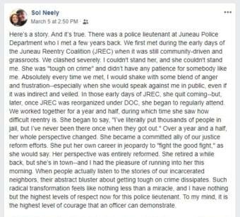 Neely is also involved with the Juneau Reentry Coalition (JREC) — an organization focused on reducing recidivism by helping formerly incarcerated people rejoin society once they get out of prison. It was at early JREC meetings that Neely and Sell clashed.