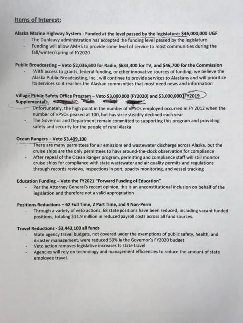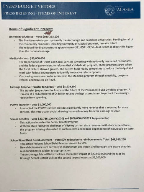 Gov. Mike Dunleavy this morning unveiled line-item vetoes the administration says amounts to another $391 million in cuts beyond the Legislature’s budget.