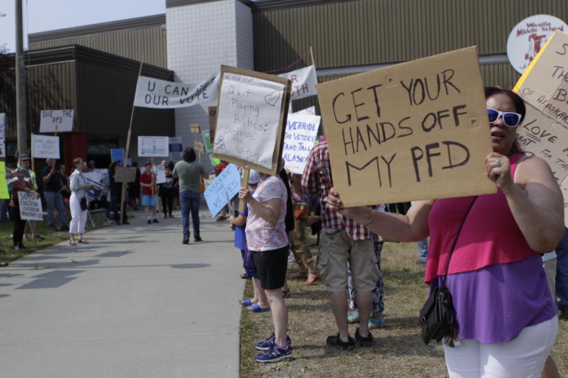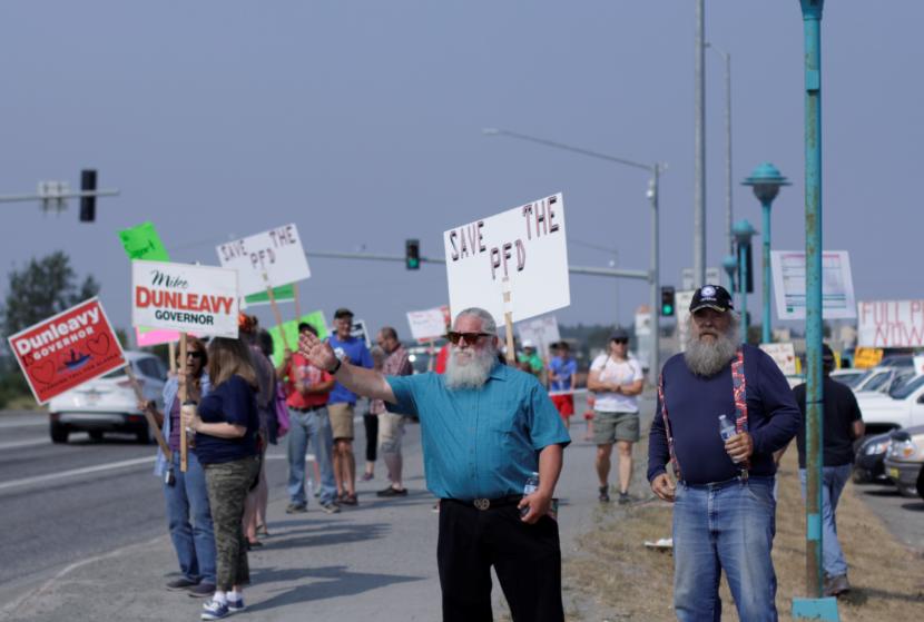 The demonstrators along the highway had gathered for an event in support of Dunleavy. One was Steven VinZant, 57, who held a “Save the PFD” sign. He said he supports the line-item vetoes because of what he sees as inefficiencies and high salaries in state government, including the University of Alaska system, which would lose $130 million if the vetoes are upheld.