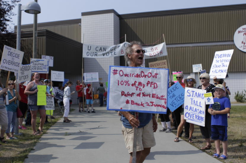 Dozens of constituents turned out, first lining a stretch of the Parks Highway before walking to Wasilla Middle School, where they greeted lawmakers with dueling chants: “Save our state,” “Follow the law” and “Override!”