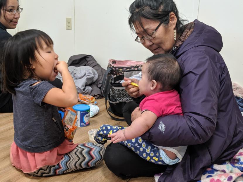 Albertina Charles feeds her grandchildren for the first time in their new home in Mertarvik. (Photo by Greg Kim/KYUK)