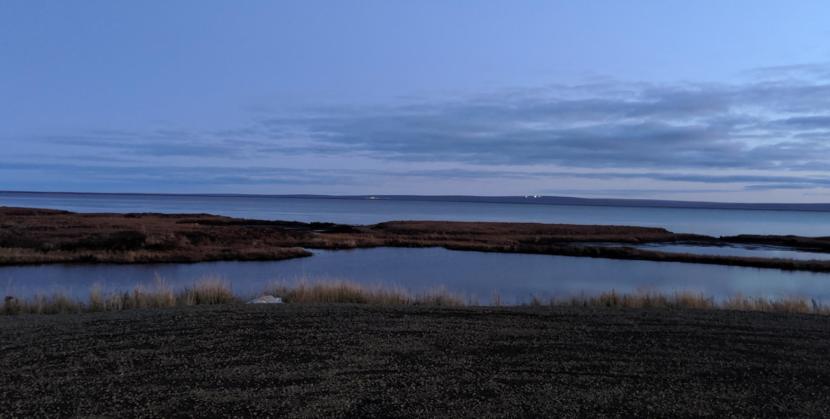 As dusk sets on Newtok’s airport, lights from homes in Mertarvik emerge across the river. The light on the right comes from the rock quarry. (Photo by Greg Kim/KYUK)