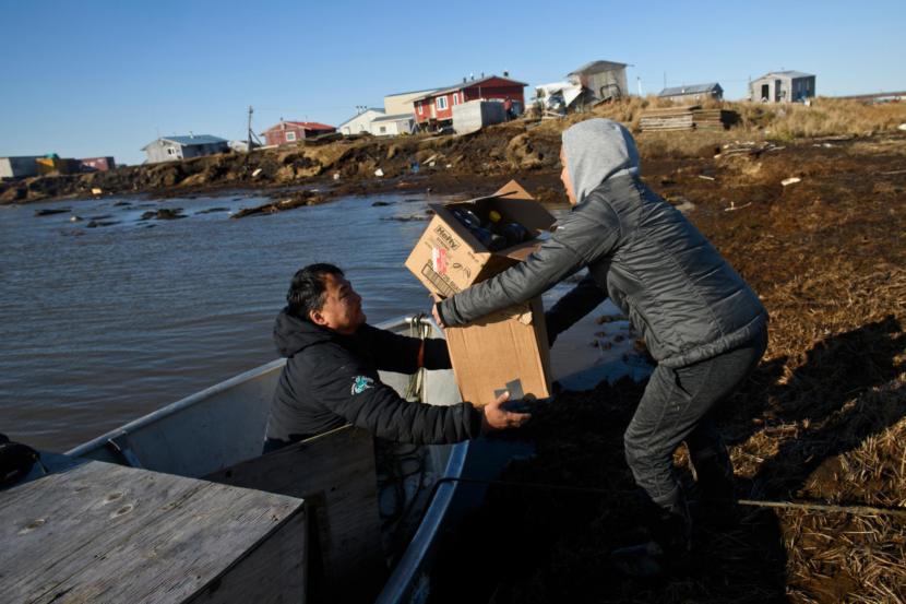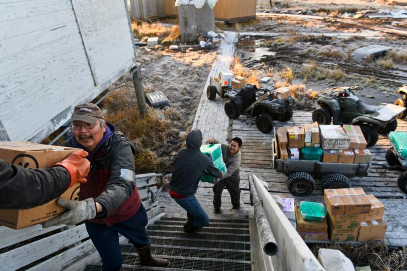 Albert Active, left, and others move boxes filled with supplies for the new school in Mertarvik onto four-wheelers in Newtok.