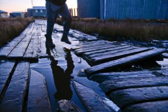 As Newtok has waited, its boardwalk has sunk into the ground. Residents describe it as “spongy” because of the soft mud underneath. (Photo by Marc Lester/Anchorage Daily News)