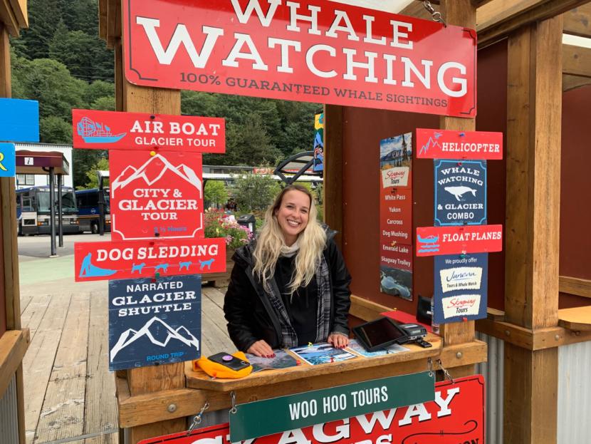Sam is here from Utah for the season. It’s her second summer in Juneau. She’s selling glacier tours, whale watching trips, float plane rides and scenic helicopter tours.