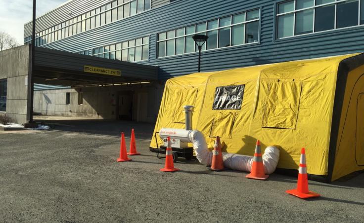 All visitors to the front entrance of the hospital and the emergency department will have to pass through a yellow triage tent to answer a set of screening questions.