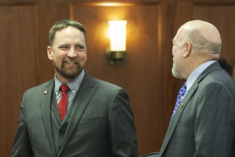 Rep. Ben Carpenter, R-Nikiski, talks to Rep. Adam Wool, D-Fairbanks, on Tuesday, January 21, 2020 in Juneau, Alaska. (Photo by Rashah McChesney/KTOO)