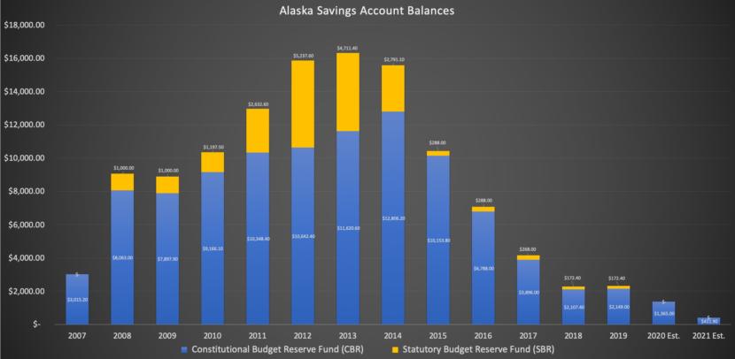 In recent years, lawmakers have covered Alaska’s substantial deficits with money stashed away when oil prices were higher. Just six years ago, the state had more than $15 billion deposited in the CBR and another account, the Statutory Budget Reserve.