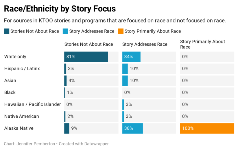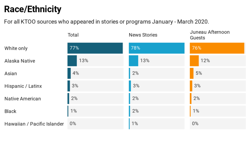 While 69% of Juneau’s residents identify as white-only, 77% of KTOO’s total sources for the past 3 months were white-only.
