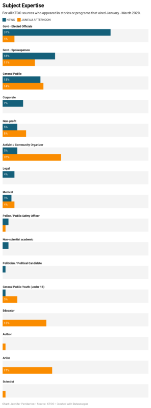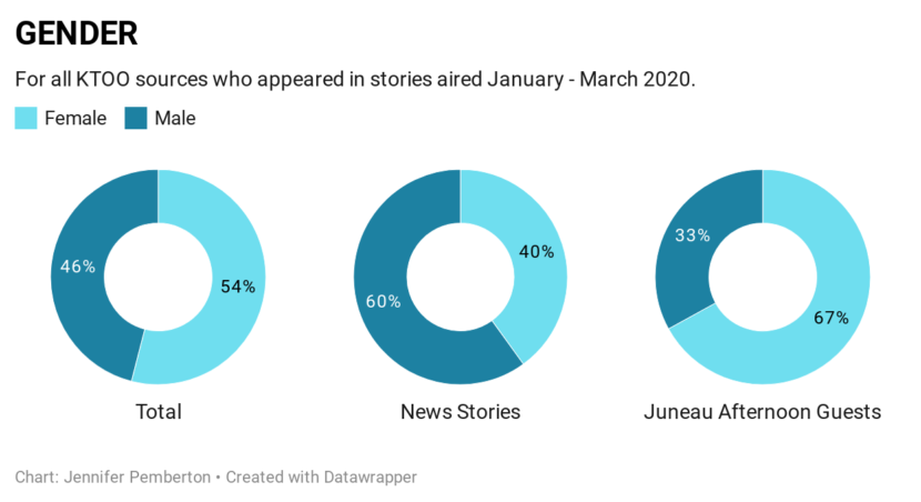 In the summer of 2019, KTOO commissioned a source audit, or a report on the make-up of the sources we use for KTOO news stories and the guests we have on Juneau Afternoon. The period between January through June of 2019 became our baseline data, because it was the first time we had looked at the demographics of the people whose voices we hear on the air.
