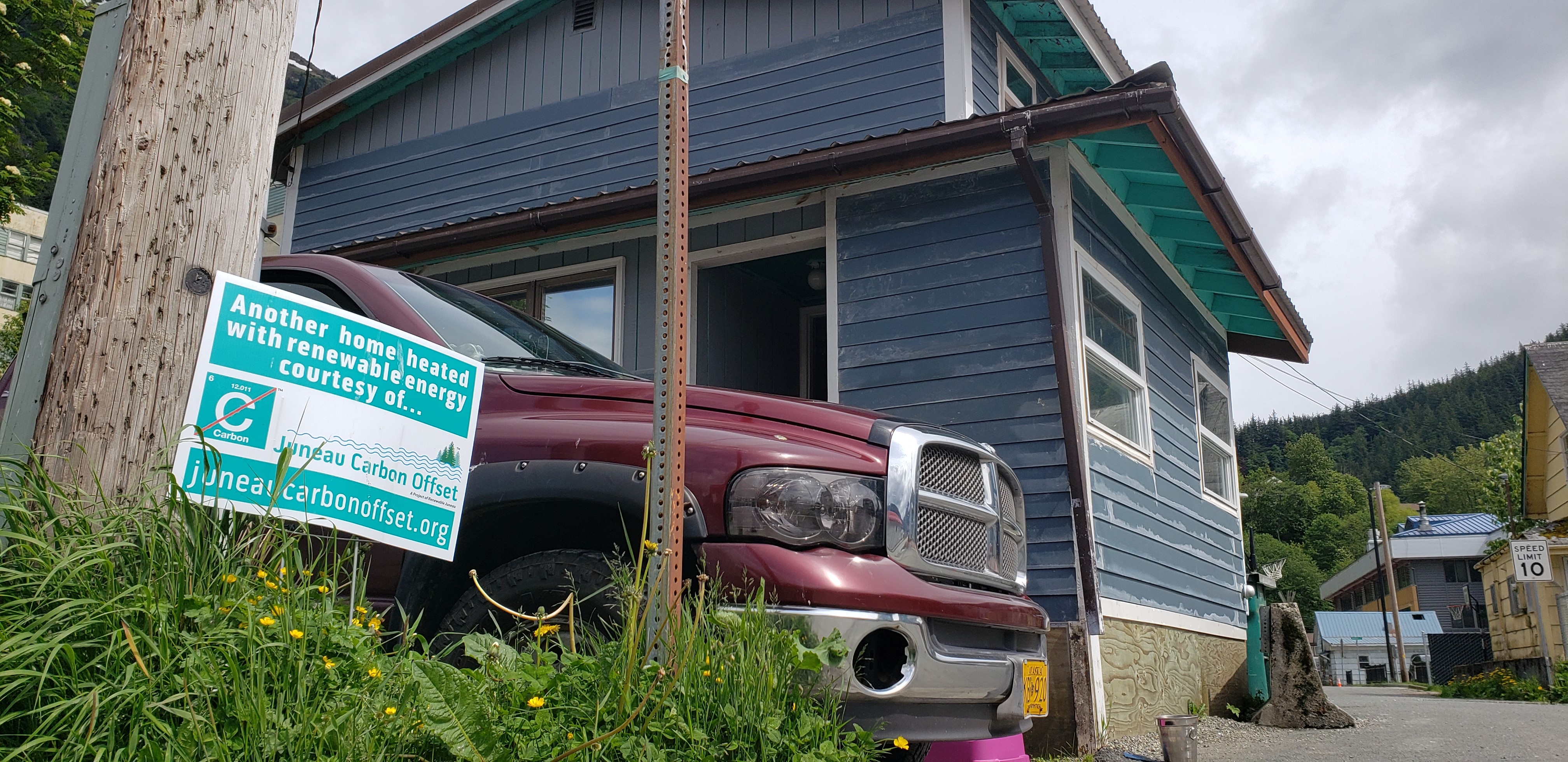 The sign says, “Another home heated with renewable energy courtesy of Juneau Carbon Offset.” That’s a program of the nonprofit Renewable Juneau. The offset fund started collecting donations last summer.
