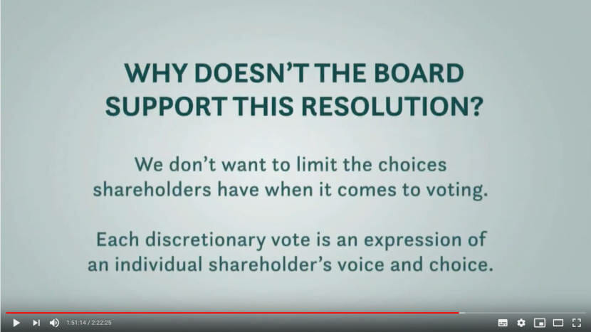 The board has released statements that say roughly one-fifth of people vote discretionary because they are consciously showing their support for the corporation. It notes that six similar proposals have been voted down since 1992.