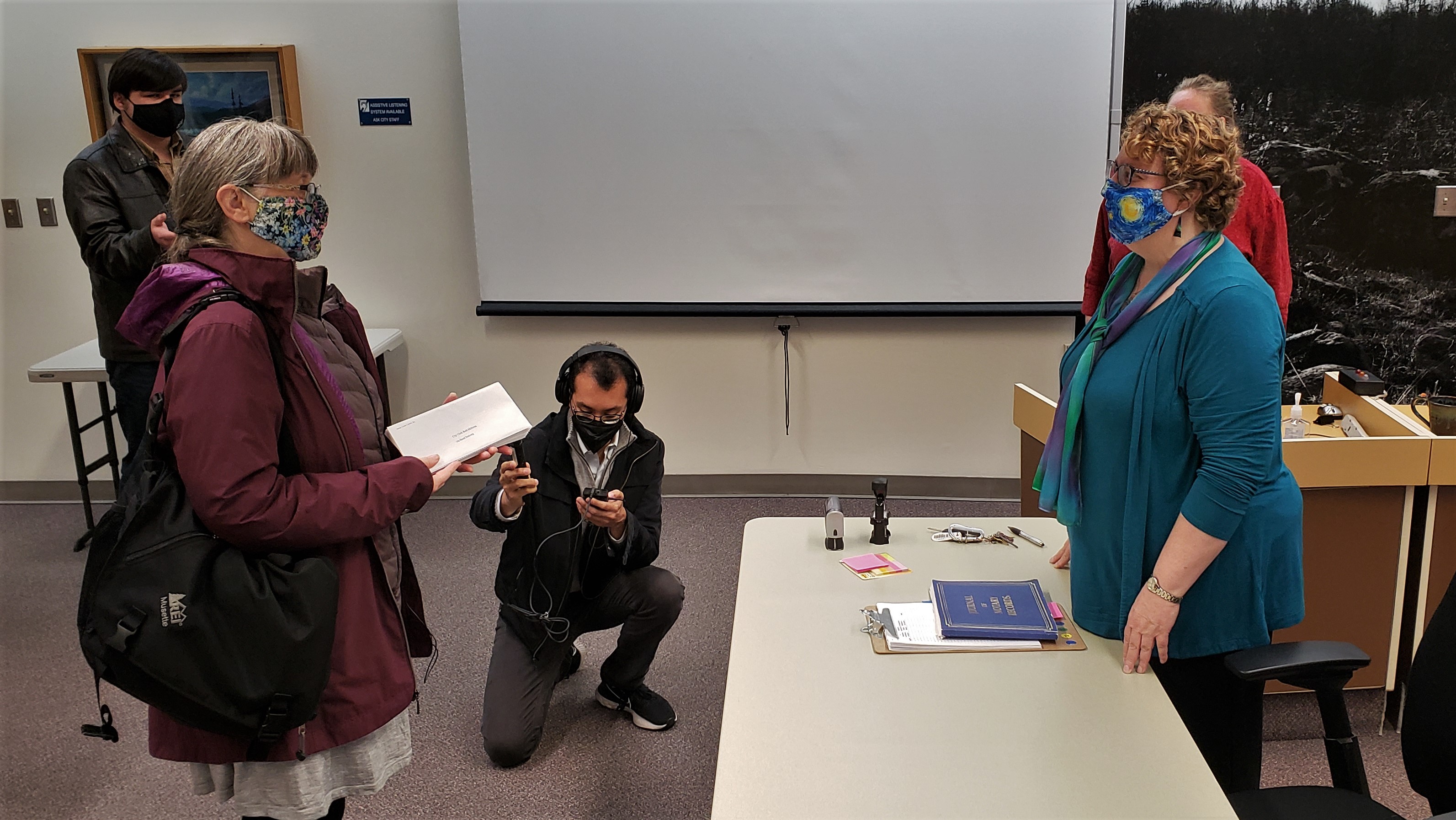Karla Hart of Juneau Cruise Control delivers letters addressed to the Juneau Assembly regarding cruise ship impacts to City Clerk Beth McEwen at City Hall in Juneau on June 2, 2021. The group wasn’t able to collect enough signatures by the deadline that day to advance ballot questions Hart proposed to limit cruise ship traffic in Juneau. (Photo by Jeremy Hsieh/KTOO)