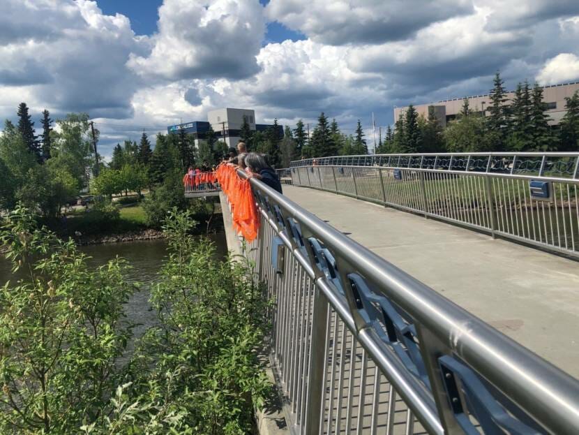 The event began with the tying of 215 orange bandanas to a clothesline, which was then strung along a footbridge over the Chena River in downtown Fairbanks. It was a symbolic gesture of acknowledgement and remembrance of the children found dead at the residential school in Kamloops, B.C.
