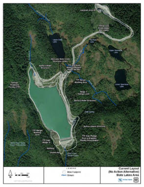 There’s an 88-foot dam in place now to hold back about 4 million tons of liquid mine waste that contains heavy metals from the ore. This tailing treatment facility, formerly known as Lower Slate Lake, lies upstream from Berners Bay which makes conservationists — and some federal regulators — nervous should it ever fail.