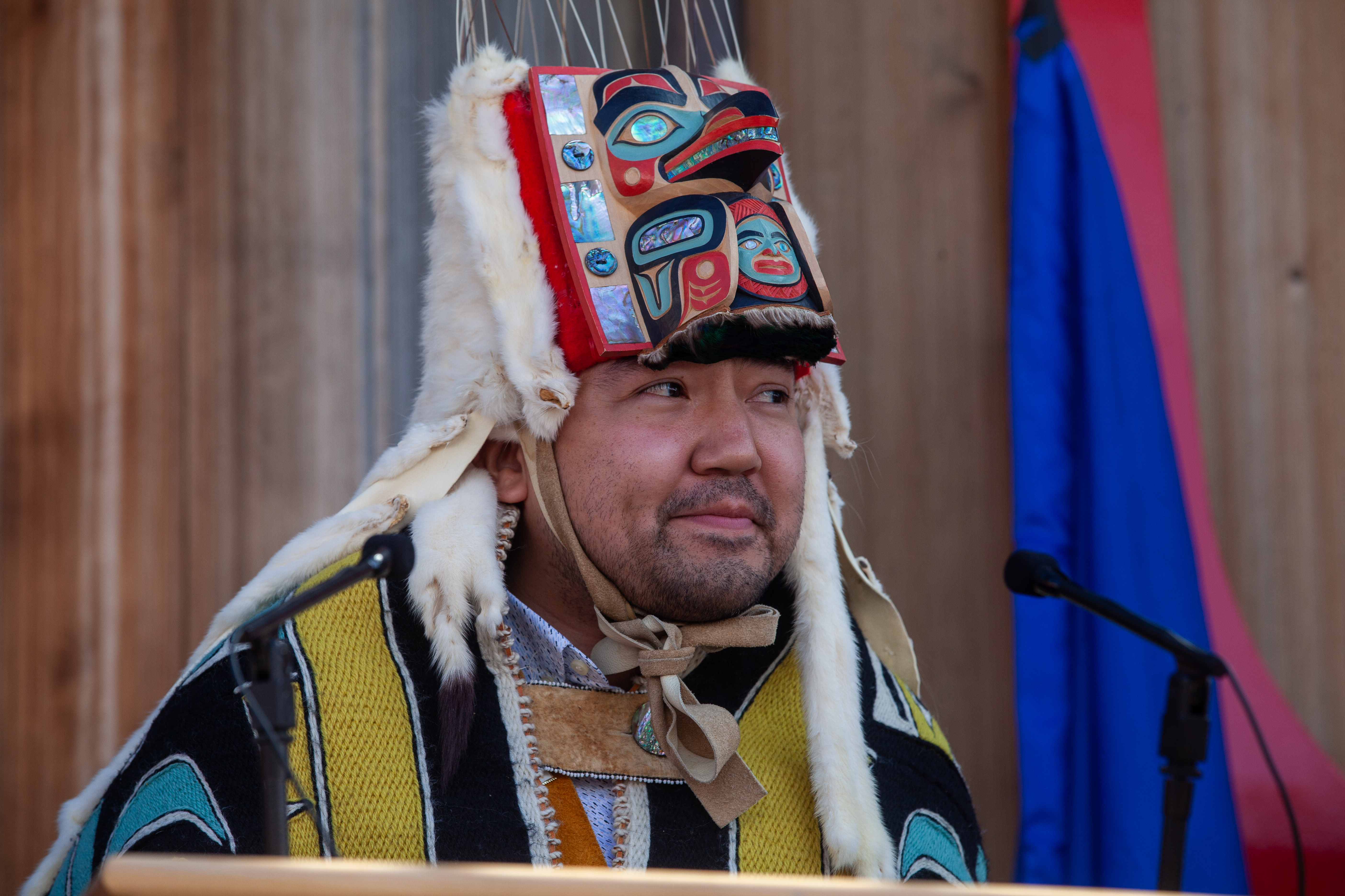 “X’úx’ daakax’úx’u is an envelope,” said X̱’unei Lance Twitchell, the emcee for the ceremony. “Which is ‘the paper around a paper.’ So, I thought maybe a stamp could be x’úx’ daakax’úx’u kalis’éex’u x’úx’. So, ‘paper around a paper, sticky paper’.”