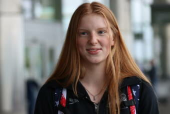Jacoby is a 17-year old high school senior from Seward and the first Alaskan swimmer ever to qualify for the Olympics. She gave a short talk to introduce herself to the kids and parents — and to let them pass around her gold and silver medals from the Tokyo Olympics. Then she warmed up in the water with the young swimmers, chatting as she moved from lane to lane.