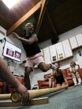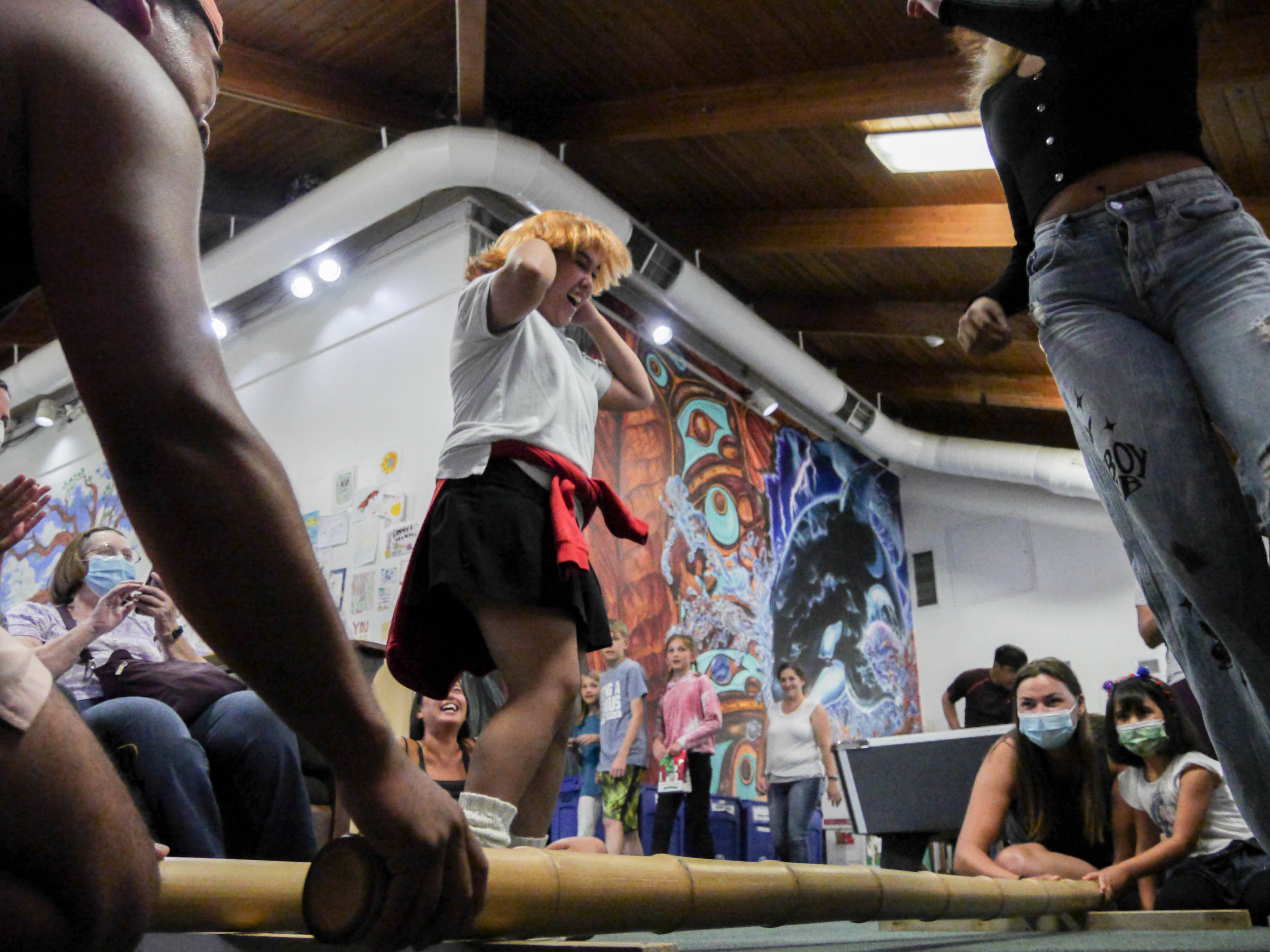 Ell Pecson tries out tinikling at the Zach Gordon Youth Center in Juneau on June 29, 2022. (Photo by Paige Sparks/KTOO)