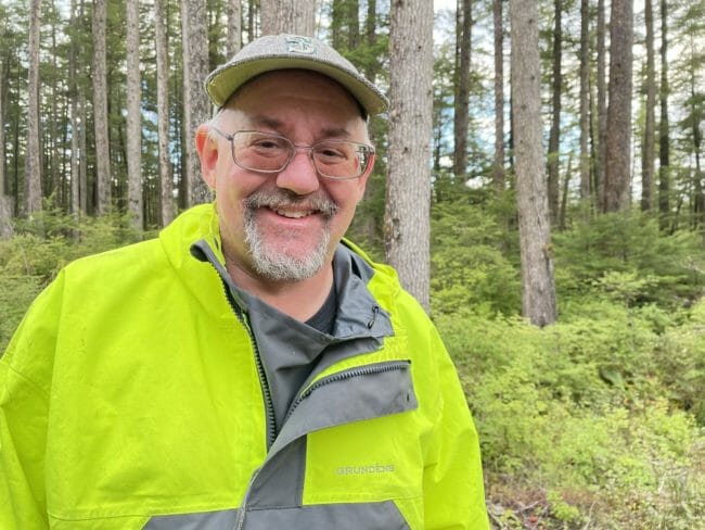 Dave Gregovich, Wildlife Habitat Analyst for the Department of Fish and Game, is a mushroom enthusiast on the hunt for winter chanterelles. He starts the search in a forest near the North Douglas highway, and looks for areas with hemlock trees and blueberries.