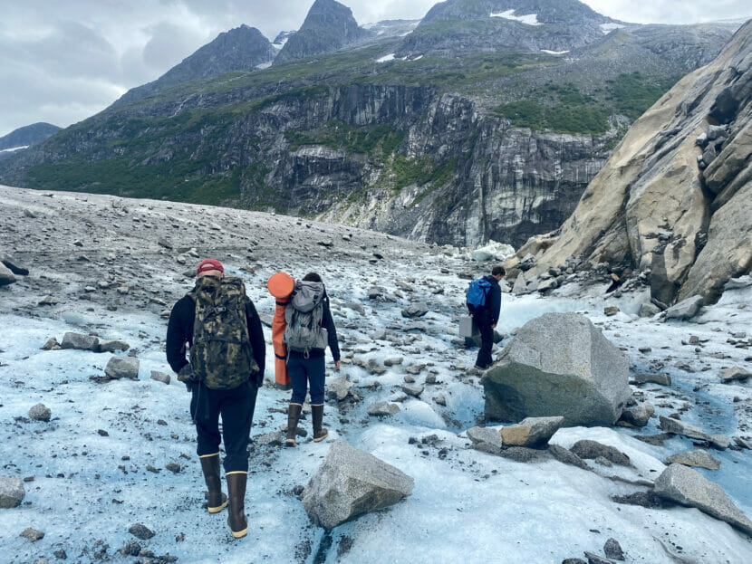 Three scientists shuffled across the vivid blue ice of the Mendenhall Glacier, following a silty channel carved between a steep mountain slope and the glacier’s edge. They wove around dripping, house-sized blocks of ice, heading toward a trail near the mouth of the channel.
