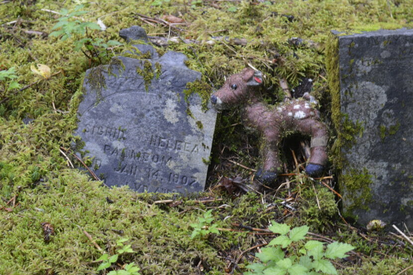 Across the road, Hasselquist shows the work they’ve done to make the city cemetery navigable again. She said that until recently, you couldn’t walk through it without chopping salmonberry bushes. Now, a low covering of deer heart leaves lays underfoot, and a toy fawn lies on one child’s grave.