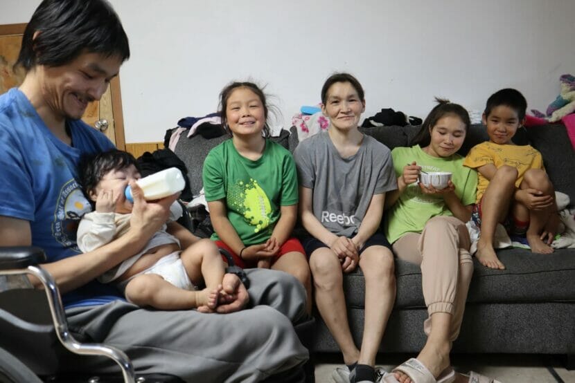 Martin Joe and his wife Lois (in gray) live in a low-income, three bedroom apartment with eight children ranging in age from one to 18. They were placed here on a temporary emergency basis after Typhoon Merbok destroyed their house in Hooper Bay. Their placement in the apartment expires at the end of the month. (Emily Schwing/KYUK)