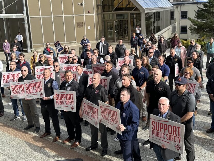 First responders gathered by the dozens outside the Alaska State Capitol in mid-April. Sen. Jesse Kiehl, D-Juneau, was one of several lawmakers who addressed the crowd.
