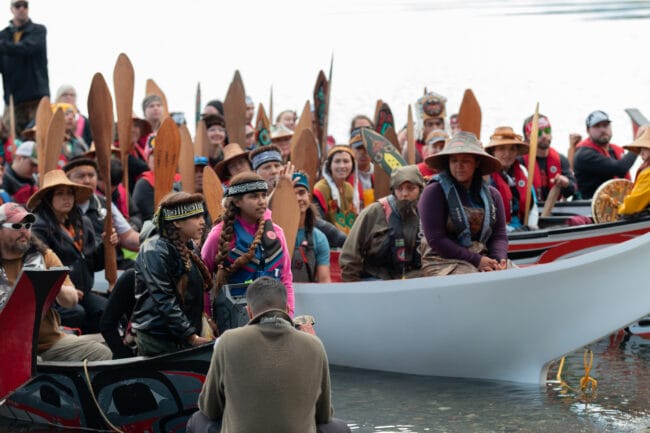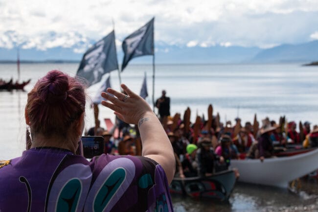 Leaders on each boat asked permission to come ashore, and Seikoonie Fran Houston, an Áak’w Ḵwáan elder, asked their reason for coming. One paddler who came from Haines answered.