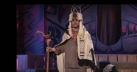 The play also incorporates cultural elements beyond language. The costumes and set feature formline designs. When Macbeth is crowned king, he dons a Ravenstail robe and a headdress adorned with ermine skins. When Banquo’s ghost haunts his killer Macbeth, he wears a raven costume.