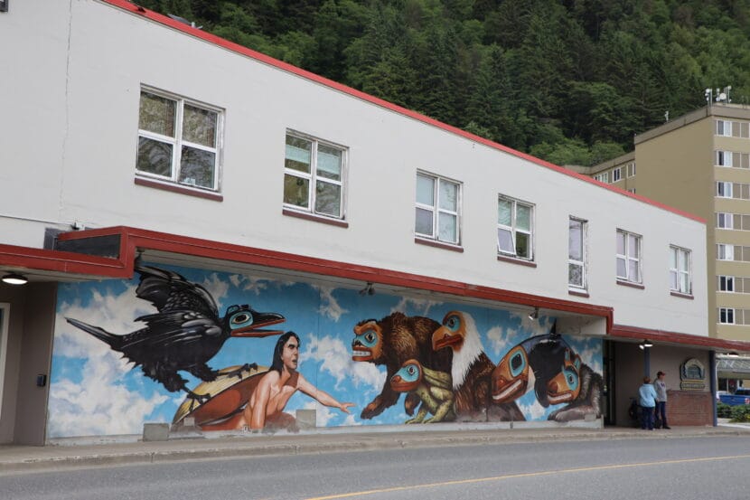 Spanning an outside wall of City Hall in downtown Juneau, there’s a 10-and-a-half by 61-foot mural called “Raven discovering mankind in a clamshell.”